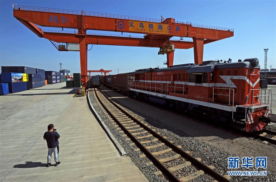 在义乌铁路西站,一列驶往西班牙马德里的中欧班列(义乌)缓缓发车(10月27日摄)。