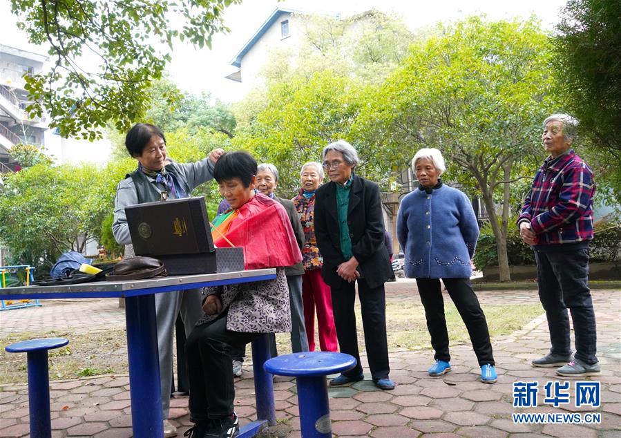 11月13日,邹勤敏(前左)在为社区居民理发。