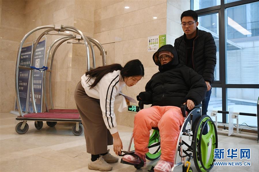 11月13日,患者和家属在甘肃省妇幼保健院使用“共享轮椅”。 近日,一批“共享轮椅”在甘肃省妇幼保健院投入使用。据介绍,患者或家属只需通过手机扫描“共享轮椅”上的二维码,缴纳押金后便可随时取还,每天2小时内免费使用。 新华社记者陈斌摄