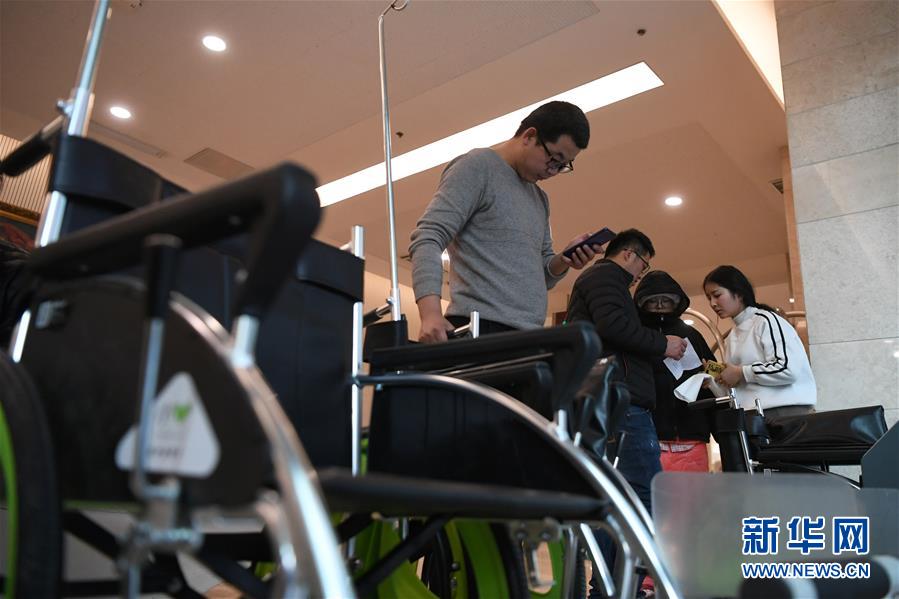 11月13日,患者和家属在甘肃省妇幼保健院门诊大厅内用手机扫码使用“共享轮椅”。 近日,一批“共享轮椅”在甘肃省妇幼保健院投入使用。据介绍,患者或家属只需通过手机扫描“共享轮椅”上的二维码,缴纳押金后便可随时取还,每天2小时内免费使用。 新华社记者陈斌摄