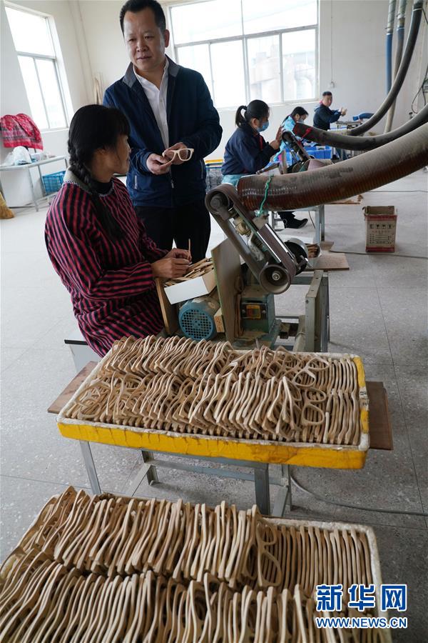 11月13日,罗小平(左二)在指导员工加工竹木眼镜镜框。 一根根普通的毛竹,通过科技创意加工,制成一副副环保、轻巧、美观的眼镜框,成品全部销往欧美。 从事这项工作的就是今年42岁的罗小平。罗小平是江西省奉新县人,他2001年到温州打工,2014年携带资金和设备返回家乡,在家乡丰富的竹木资源上做文章。他创办了江西小平竹木眼镜有限公司,在全竹木镜框技术上获得突破,批量生产了全套竹木材料眼镜框架。 目前,罗小平和他的团队已申报多项国家发明专利和实用新型专利,公司发展进入快车道,带动周边村民一同致富。 新华社记者宋振平摄