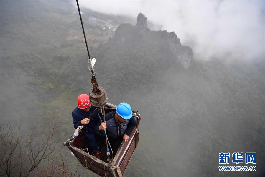 11月13日,探水队队员乘坐铁吊篮到朝东岩绝壁中间的天宝洞施工引水。 湖北省恩施土家族苗族自治州恩施市屯堡乡田凤坪村位于朝东岩绝壁下方,这个村子是恩施市深度贫困村之一。每年10月到次年3月,当地降水减少,这个村就会面临缺水问题,近800名村民要四处找水喝。 今年10月份,驻村扶贫工作队和村民组成探水队,在朝东岩绝壁中间——距岩底300多米、岩顶100多米的天宝洞内,寻得一处水源。 经一个月的铺设管道、送发管线等工作,目前,清泉已从山洞引出,到达田凤坪村,预计过年之前村民们都能喝上清甜的山泉水。 新华社发(杨顺丕 摄)