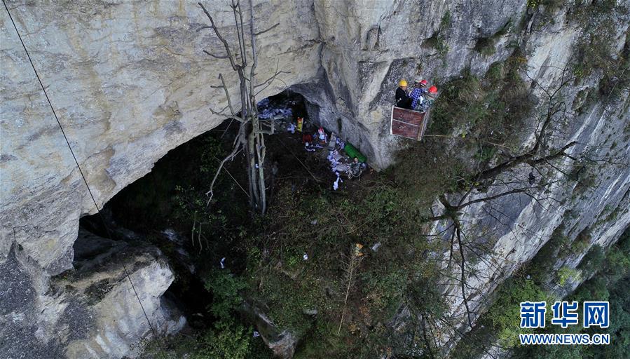 10月31日,探水队队员乘坐铁吊篮到朝东岩绝壁中间的天宝洞(无人机拍摄)。 湖北省恩施土家族苗族自治州恩施市屯堡乡田凤坪村位于朝东岩绝壁下方,这个村子是恩施市深度贫困村之一。每年10月到次年3月,当地降水减少,这个村就会面临缺水问题,近800名村民要四处找水喝。 今年10月份,驻村扶贫工作队和村民组成探水队,在朝东岩绝壁中间——距岩底300多米、岩顶100多米的天宝洞内,寻得一处水源。 经一个月的铺设管道、送发管线等工作,目前,清泉已从山洞引出,到达田凤坪村,预计过年之前村民们都能喝上清甜的山泉水。 新华社发(杨顺丕 摄)