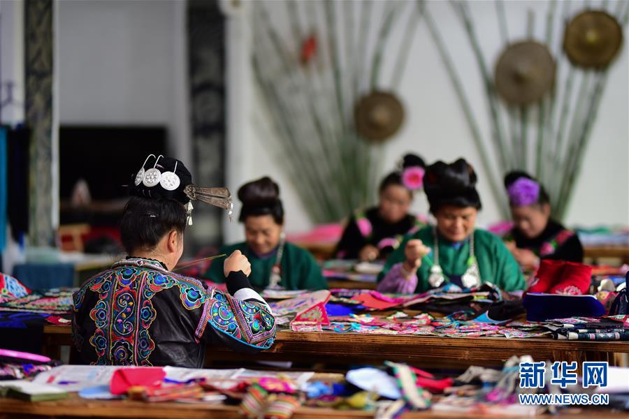 11月13日,村民在贵州省丹寨县嘎闹刺绣合作社刺绣。