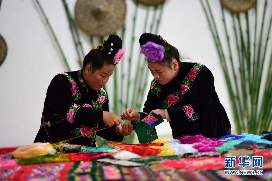 11月13日,村民在贵州省丹寨县嘎闹刺绣合作社挑选刺绣彩线。