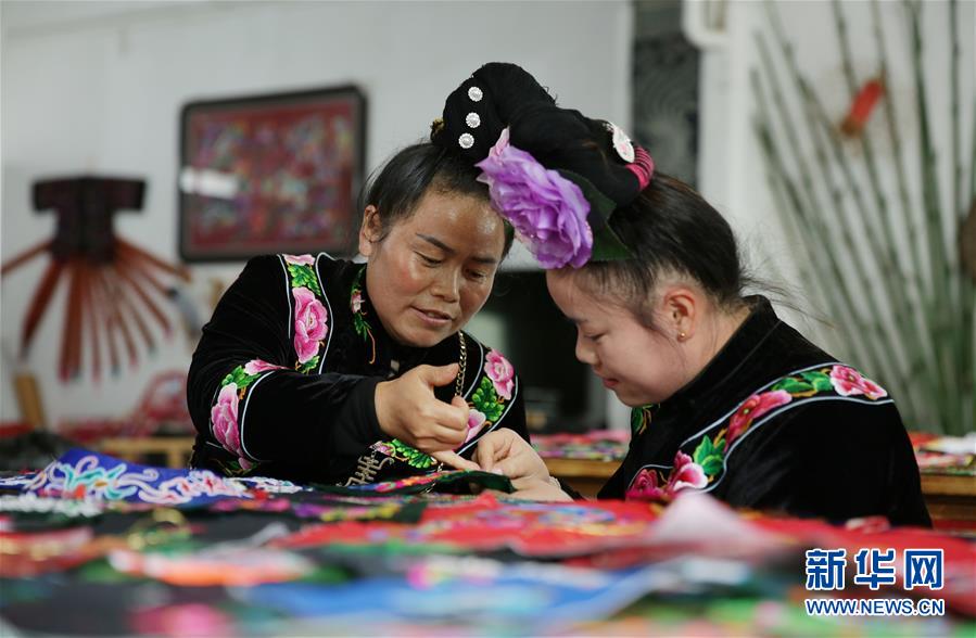 11月13日,村民在贵州省丹寨县嘎闹刺绣合作社探讨刺绣技艺。