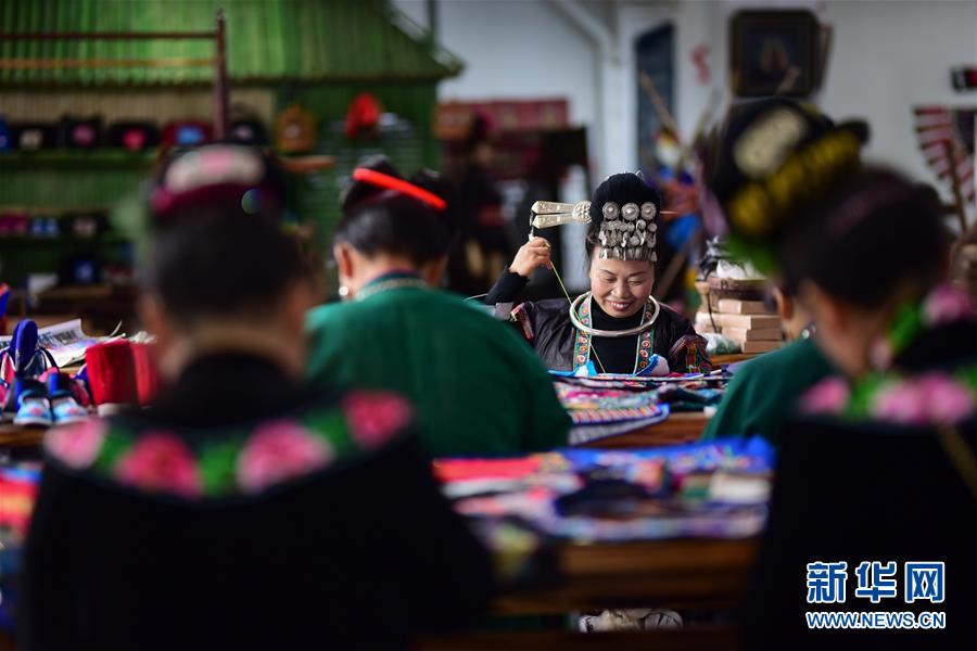 11月13日,村民在贵州省丹寨县嘎闹刺绣合作社刺绣。