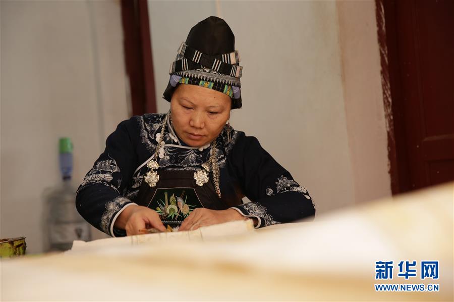 11月13日,在贵州省丹寨县金钟易地扶贫安置点,村民龙光美在家里绘制蜡画。