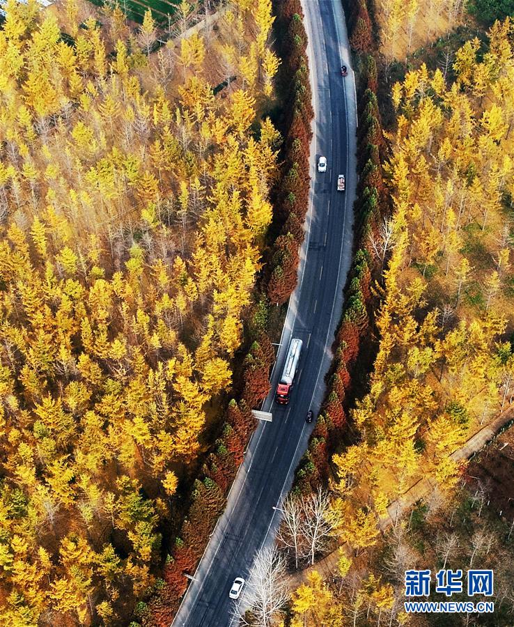 这是临沂市郯城县胜利镇道路两旁的银杏树(11月13日无人机拍摄)。 初冬时节,山东省临沂市郯城县银杏林一片金黄,银杏黄叶飘落满地,美景如画,吸引各地游客前来观光。郯城县银杏种植面积达30万亩,有“银杏之乡”的美誉。 新华社发(张春雷 摄)