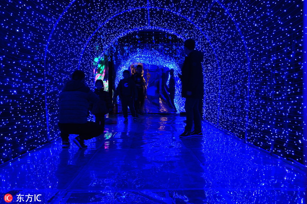 2018年11月13日,西安大唐西市室内灯光秀五彩斑斓,配着美妙动听的音乐,一闪一闪亮晶晶,让人行走在里面,宛如穿越时空隧道,整齐排列的门帘式水晶灯带下,众多民众摆着各种姿势争相拍照,体验满满的魔幻意境、时尚动感和科技感,更给寒冷的冬夜带来了一场温暖浪漫梦幻的视觉盛宴。彭华/东方IC