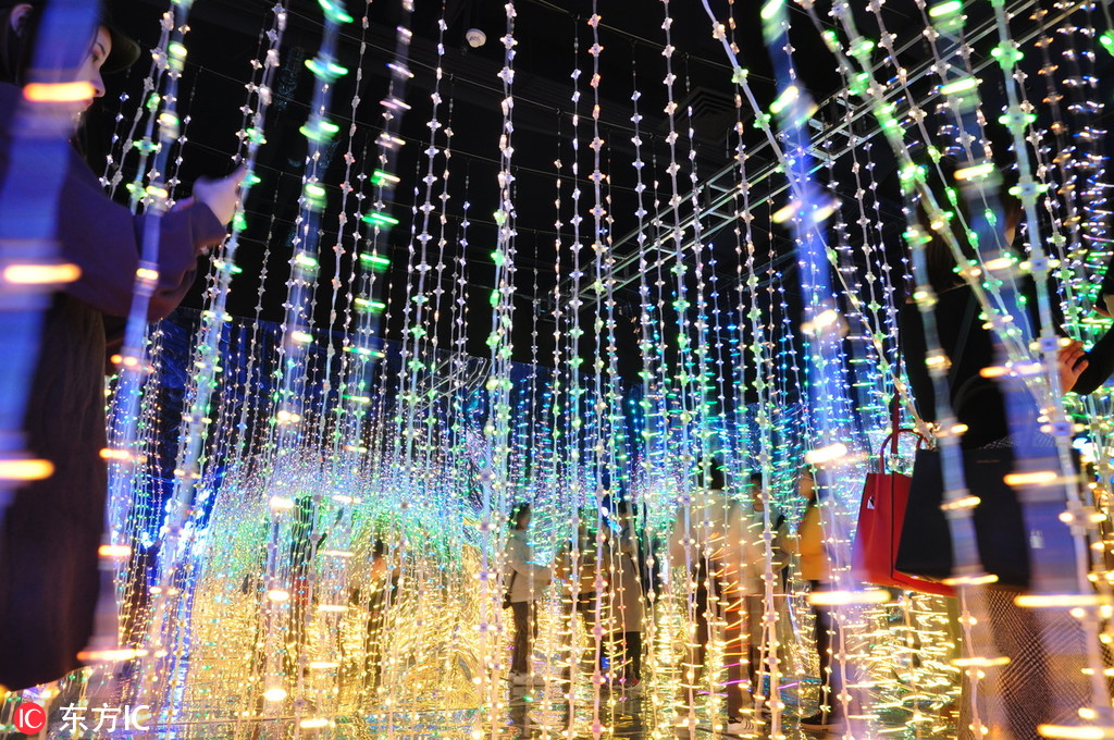 2018年11月13日,西安大唐西市室内灯光秀五彩斑斓,配着美妙动听的音乐,一闪一闪亮晶晶,让人行走在里面,宛如穿越时空隧道,整齐排列的门帘式水晶灯带下,众多民众摆着各种姿势争相拍照,体验满满的魔幻意境、时尚动感和科技感,更给寒冷的冬夜带来了一场温暖浪漫梦幻的视觉盛宴。彭华/东方IC