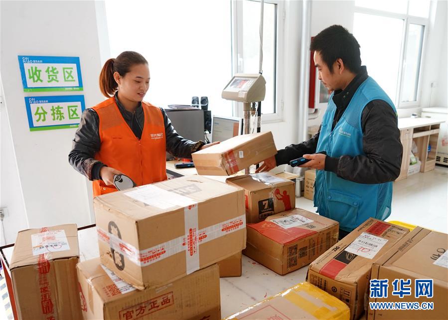11月14日,肃宁县农村电子商务公共服务中心的工作人员在分拣网上销售的商品。 新华社记者杨世尧摄