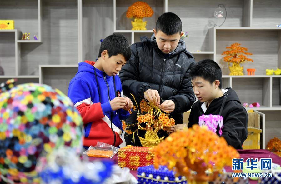11月14日,在湖北省宣恩县荧屏特殊教育学校,聋哑学生进行手工制作。