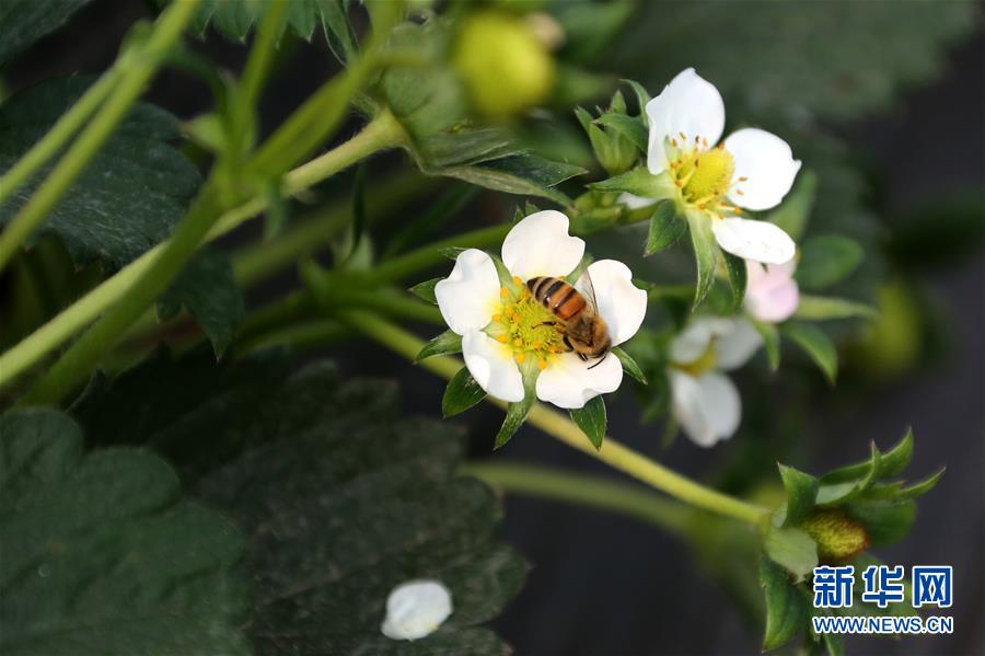 11月14日,在山东省枣庄市市中区孟庄镇峨山口村一草莓种植基地暖棚内,一只蜜蜂在授粉。 初冬时节,山东省枣庄市市中区农民抢抓农时,对1万多亩温室大棚内种植的越冬蔬菜、瓜果、食用菌等进行管理,暖棚内一派忙碌景象。 新华社发(孙中喆 摄)