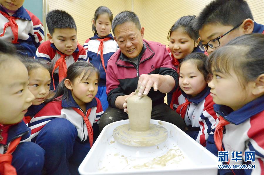 11月14日,在河北省邯郸市邯山区农林路小学,制陶艺人向学生示范制陶过程。 近年来,河北省邯郸市邯山区农林路小学将陶艺制作列为校本课程,为喜爱陶艺的学生开办陶艺教学班,同时建立起集教学、创作、展览于一体的陶艺教育创作基地,让孩子们感受陶艺的魅力。 新华社记者 朱旭东 摄