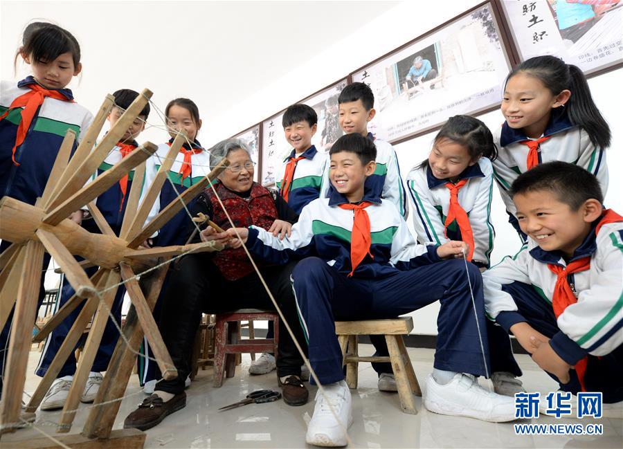 11月14日,魏县第三完全小学学生在非遗传承人的指导下体验土纺土织传统技艺。
