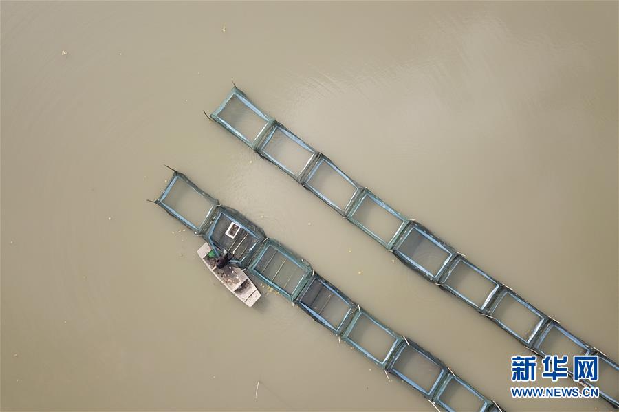 11月14日,江苏省淮安市洪泽区西顺河镇蟹农在打理网箱(无人机拍摄)。 初冬时节,江苏省淮安市洪泽区西顺河镇螃蟹养殖户将螃蟹储养在网箱里,定期给予喂食,待到春节期间投入市场。 新华社发(万震 摄)