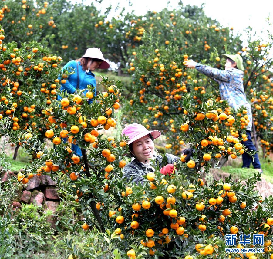 11月13日,江西省南丰县市山镇包坊村的桔农在桔园采摘蜜桔。 近日,江西省抚州市南丰县70万亩蜜桔迎来收获季,桔农们通过水路成批运输蜜桔,满载而归。 新华社发(梁振堂 摄)