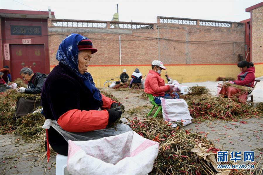 11月14日,襄汾县赵康镇牛席村的村民在处理收获的辣椒。