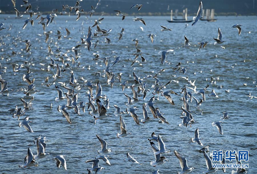 近日,云南省昆明市阳光明媚、气候宜人,不少市民和游客来到滇池大坝、大观公园等地,观赏前来越冬的红嘴鸥。