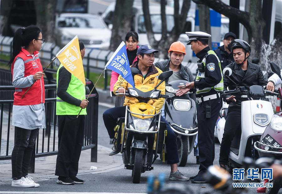 11月14日,交警在对一名外卖“骑手”进行安全警示,提示他注意骑行安全。 从9月中旬开始,浙江省温州市公安交警部门针对城市道路中快递外卖“骑手”违规行为突出的情况,联合市文明办等单位开展快递外卖企业文明守法活动,出台“四色”考评办法,每月根据外卖“骑手”文明守法情况予以绿、蓝、黄、红四色进行分级评定,并对违规较多的“骑手”所属企业进行重点约谈、重点整治,提升快递外卖配送人员的文明骑行意识。 新华社记者 徐昱 摄