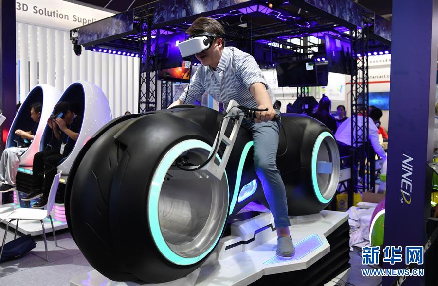 11月14日,观众在高交会体验VR娱乐设施。 当日,第二十届中国国际高新技术成果交易会在深圳开幕,40多个国家、地区、国际组织的60多个团组带来了1000多项新产品、新技术。 新华社记者 毛思倩 摄