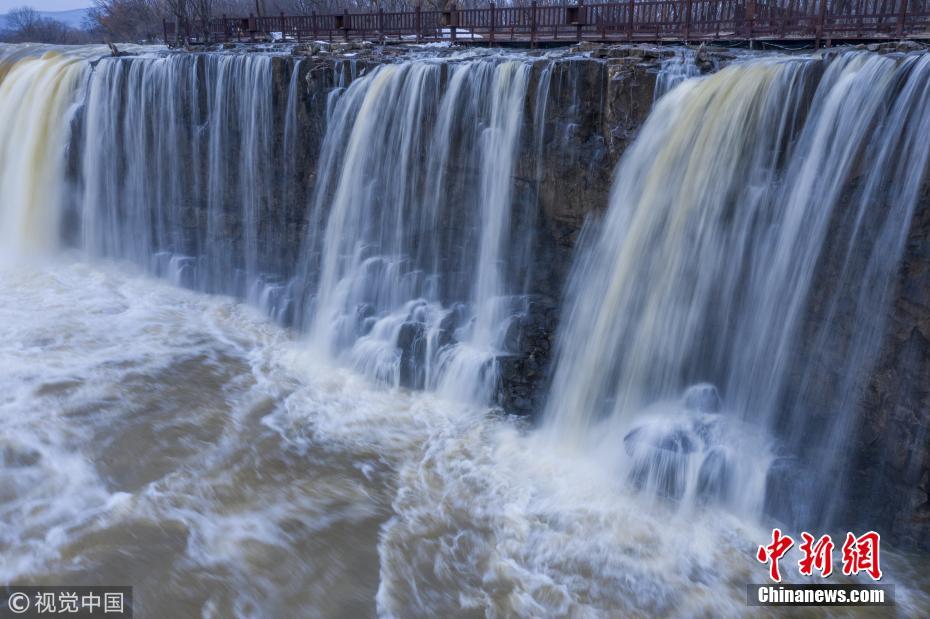 11月13日早晨,黑龙江牡丹江,阴天给世界地质公园镜泊湖带来神秘的蓝调,与吊水楼瀑布黄色的流水形成对比。孙长山 摄 图片来源:视觉中国