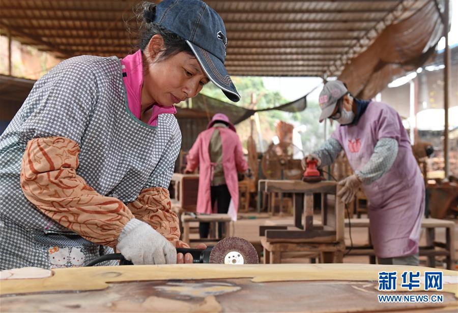 11月15日,建瓯市徐墩镇贫困户潘小英(前)在一家根雕厂加工茶盘。在结对扶贫干部的帮助下,她找到了脱贫致富门路。