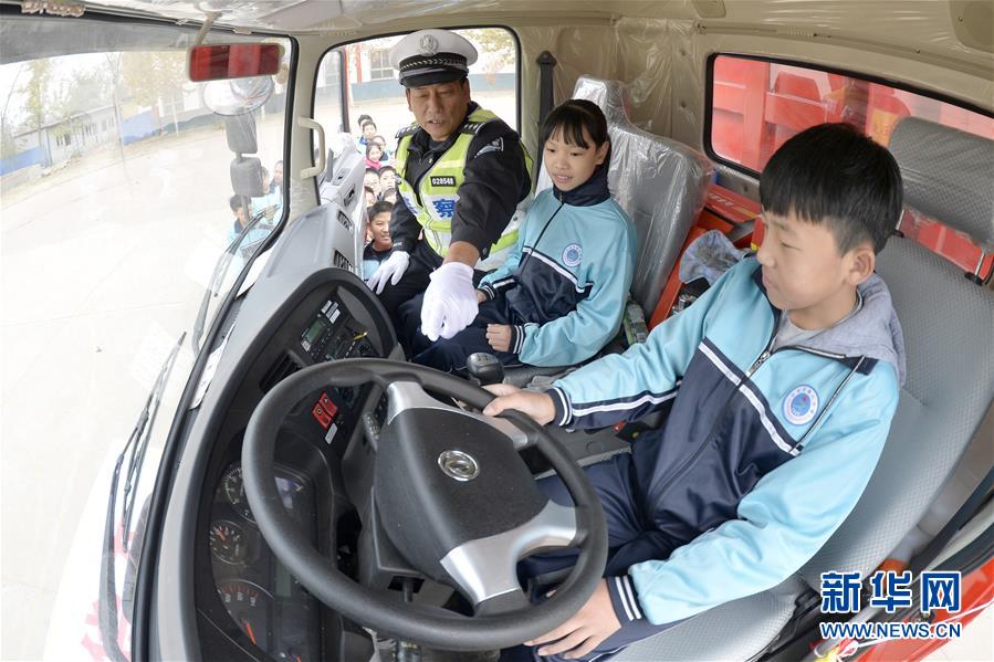11月15日,在河北省沙河市第六中学,沙河市交警大队民警邀请学生进入货车驾驶室,向学生讲解货车盲区相关知识。当日,河北省沙河市第六中学开展与大货车有关的交通安全主题教育活动,学校邀请交警向学生普及货车盲区和道路交通安全知识,引导学生增强交通安全意识,提高自我保护能力。新华社发(陈雷 摄)