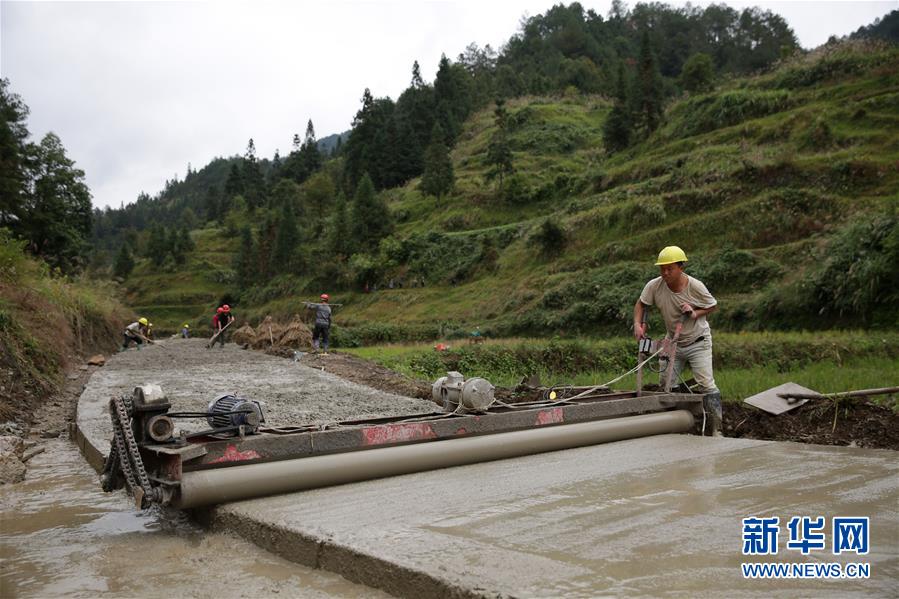 11月15日,在贵州省丹寨县扬武镇乌湾村,施工人员在修建乡村道路。近年来,贵州省丹寨县在脱贫攻坚的过程中,注重加快乡村公路建设、助力乡村振兴,解决乡村居民出行难、物产运输难的问题,将乡村公路变身扶贫路,为居民编织起致富网络。新华社发(黄晓海 摄)
