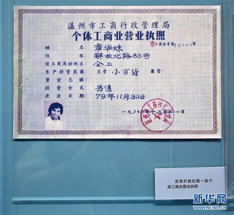 这是在“历史巨变”展区拍摄的改革开放后第一张个体工商业营业执照(11月15日摄)。新华社记者 李鑫 摄 图片来源:新华网