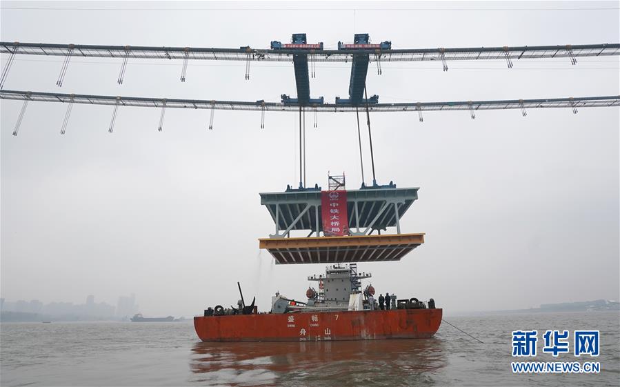 11月15日,缆载吊机在吊装重达1000吨的钢梁。新华社记者 程敏摄
