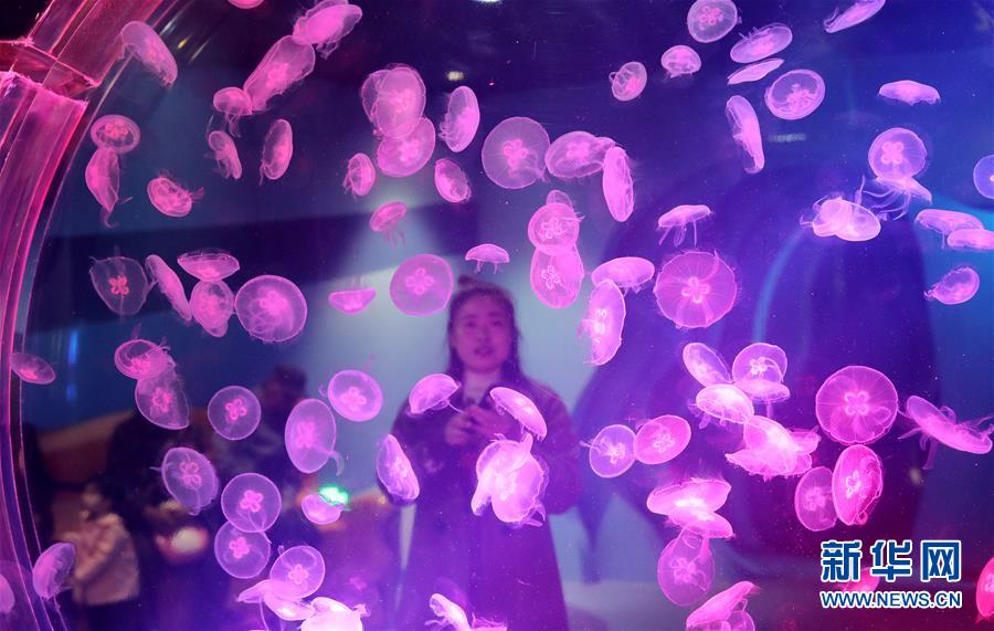 11月16日,一名游客在上海海昌海洋公园观赏水母。当日,位于上海浦东新区临港新城的上海海昌海洋公园正式开门迎客。公园包括“人鱼海湾”“极地小镇”“冰雪王国”“海底奇域”“海洋部落”等五大主题区以及一座海洋主题酒店。新华社记者 方喆 摄