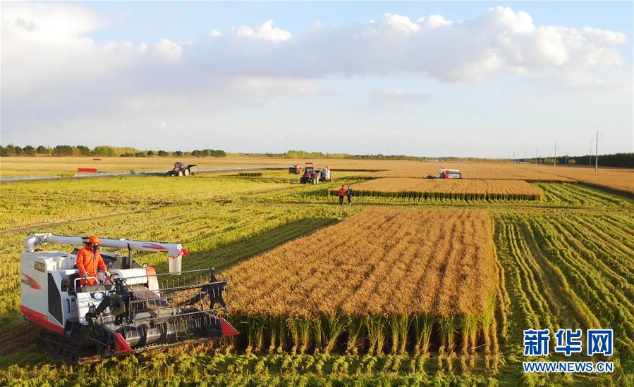 收割机在黑龙江省三江平原一处稻田收割水稻(2017年9月28日摄)。