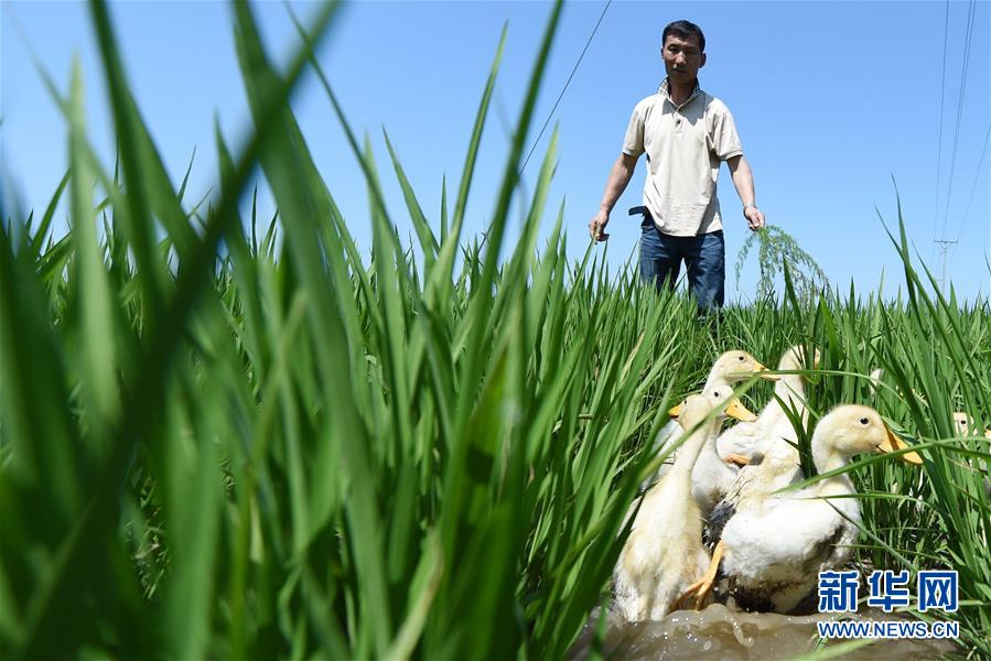 在黑龙江省五常市一有机水稻生产基地,种植户在赶雏鸭(7月5日摄)。