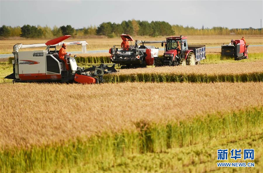 收割机在黑龙江省三江平原一处稻田收割水稻(2017年9月28日摄)。