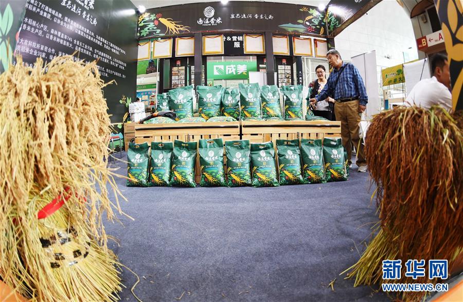 在第四届黑龙江国际绿色有机食品产业博览会上,参会者在一大米加工企业展区了解产品情况(2016年9月22日摄)。