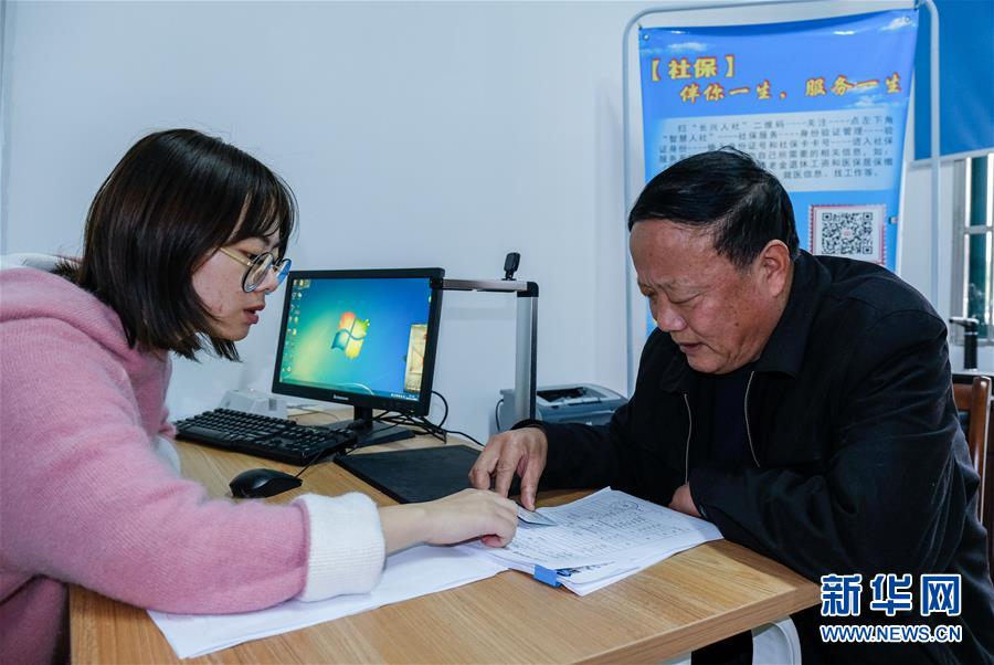 11月16日,村民(右)在二界岭村社保服务点办理参保手续。近年来,浙江省湖州市长兴县泗安镇积极推行“最多跑一次”改革,镇便民服务中心于2018年8月在偏远的二界岭村设立社保服务点,方便百姓在家门口办理社保业务,打通服务“最后一公里”,最大限度为办事群众提供便利。新华社记者 徐昱 摄