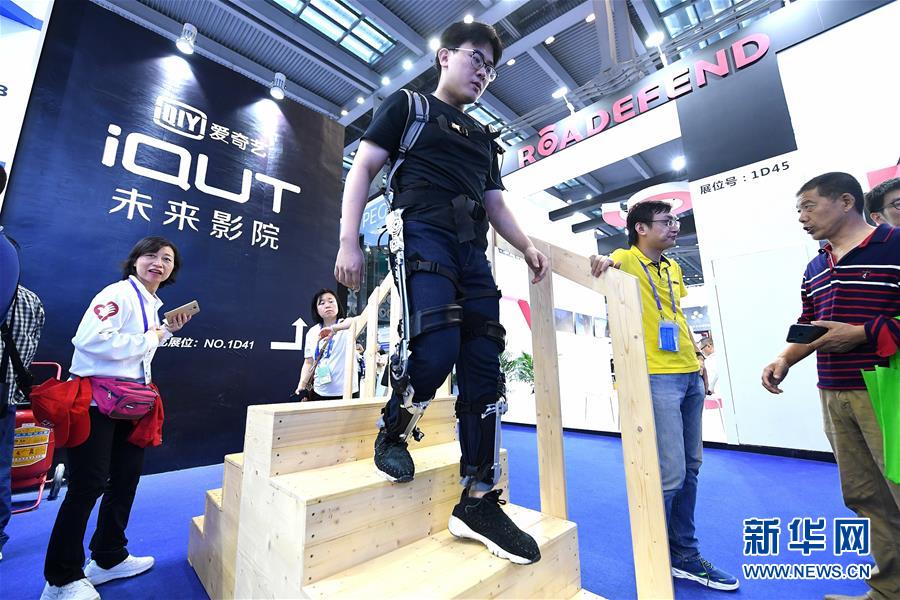 11月16日,工作人员在演示穿戴膝关节助力外骨骼上下楼梯。正在深圳举行的第二十届中国国际高新技术成果交易会上,众多体现“黑科技”的产品纷纷亮相,吸引观众参观体验。新华社记者 毛思倩 摄