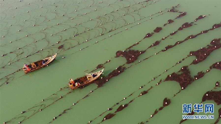 这是11月15日在山东省荣成市拍摄的海带放苗场景(无人机拍摄)。眼下又到了海带“播种”期,山东省荣成市海带养殖海域一派繁忙,养殖工加紧夹苗,船只往返穿梭运送海带苗。据了解,山东省荣成市海带养殖面积超15万亩。新华社发(王福东 摄)