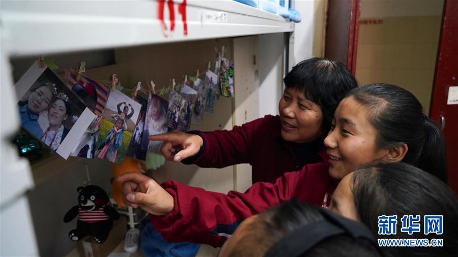 11月16日,南昌市第十七中学西藏班的学生通过照片给“爱心妈妈”刘和平(左一)介绍家中情况。新华社记者 胡晨欢 摄