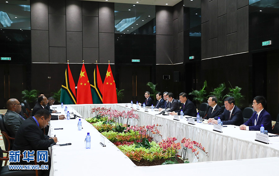 11月16日,国家主席习近平在莫尔兹比港分别会见建交太平洋岛国领导人。这是习近平会见瓦努阿图总理萨尔瓦伊。 新华社记者 谢环驰 摄