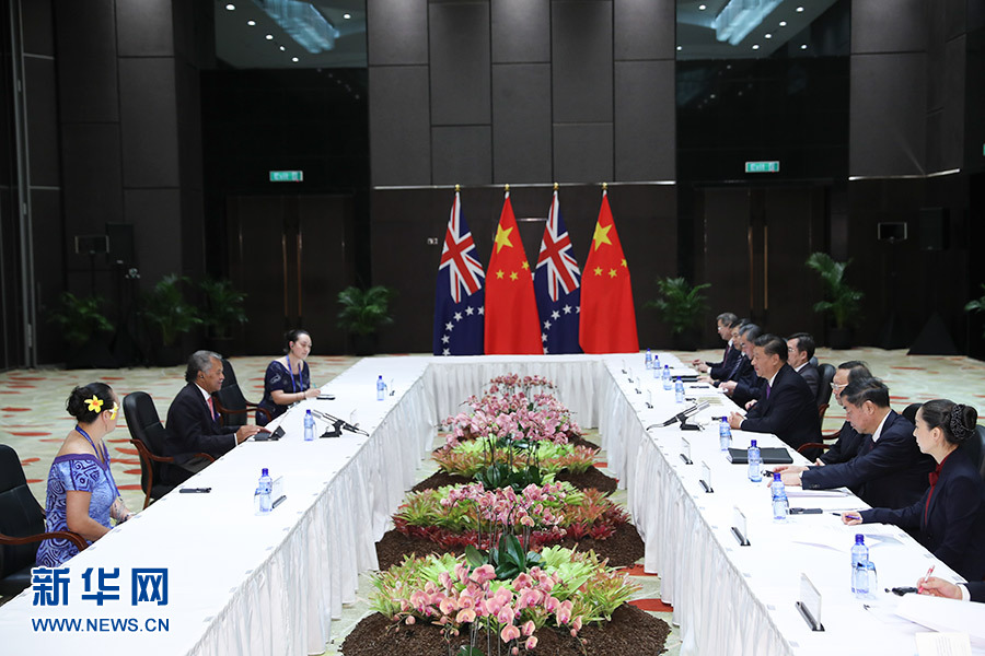 11月16日,国家主席习近平在莫尔兹比港分别会见建交太平洋岛国领导人。这是习近平会见库克群岛总理普纳。 新华社记者 丁林 摄