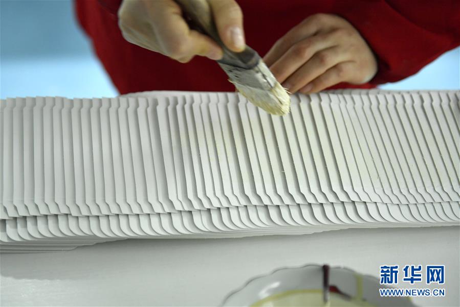 11月17日,在湖北省宣恩县伍家台村易地扶贫搬迁安置点的一家公司车间,工人在进行涂胶作业。 新华社发(宋文 摄)