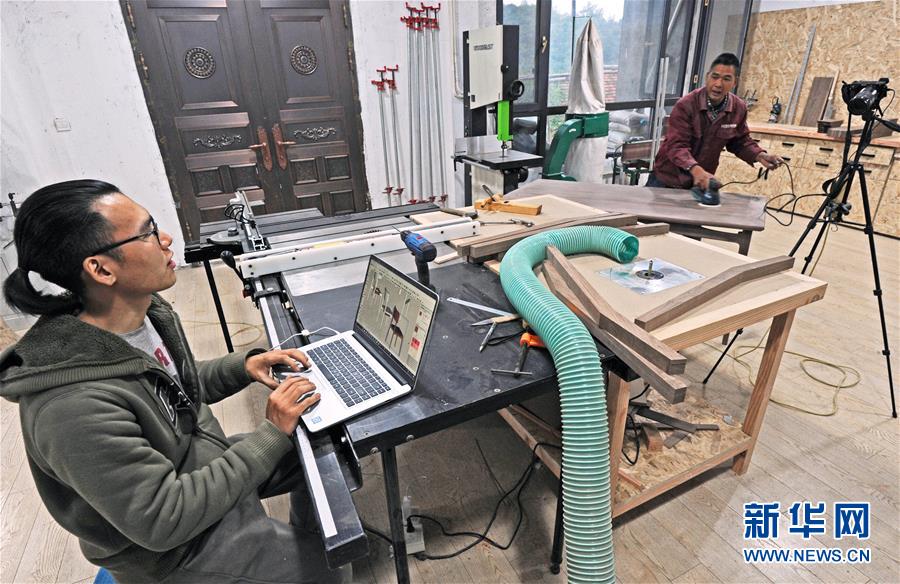 11月17日,在浙江省湖州市安吉县鲁家村,经营实木家具生意的大学毕业生庄哲(左)一边查看设计图,一边和父亲交流。 浙江省湖州市安吉县在推进全域美丽建设的同时,积极拓展大学生就业创业工作,从吸引大学生来(回)安吉就业创业、加大对大学生创新创业扶持力度、鼓励大学生面向基层就业、优化大学生就业创业服务等多个方面推出扶持政策。今年前10个月,吸引600多名大学毕业生来安吉就业创业。 新华社记者 谭进 摄