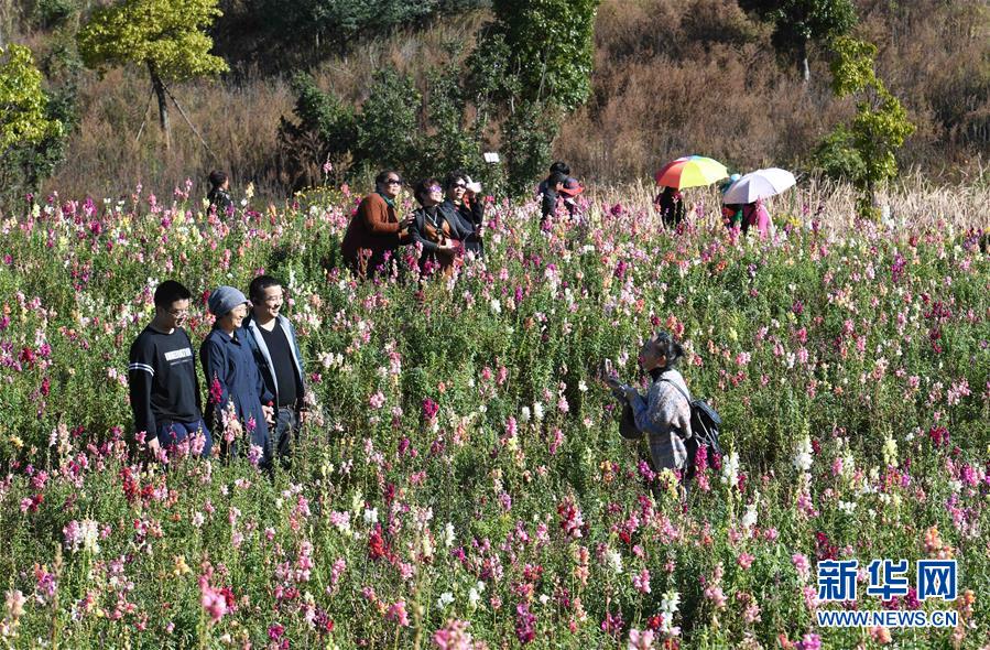 11月18日,游客在云南曲靖麒麟爱情小镇花海中拍照。