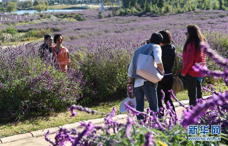 11月18日,游客在云南曲靖麒麟爱情小镇花海中拍照。