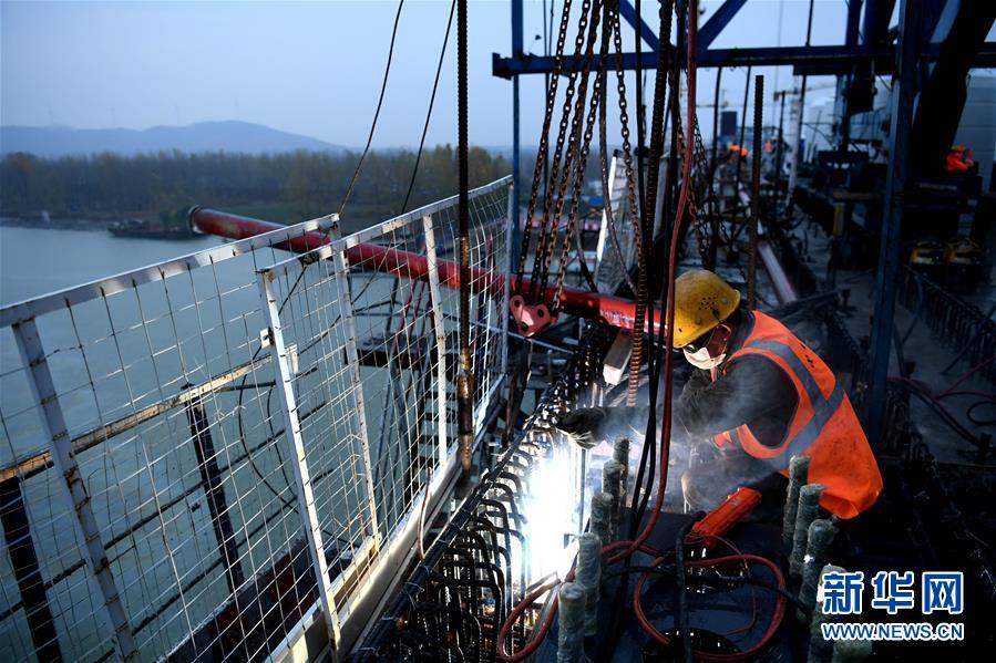 11月17日,施工人员在商合杭铁路跨淮河特大桥合龙现场作业。