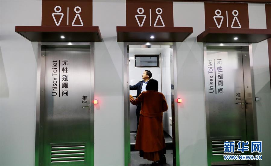 11月18日,参观者在展会现场查看展出的无性别公厕。当日,第三届中国厕所革命创新博览会在上海光大会展中心开幕。展会分为智慧厕所、农村厕所、旅游环卫厕所、商用卫生间配套设施四大板块,集中展示从生态环保厕所、智能马桶、智能出纸机到新型厕所材料、第三卫生间设施等产品。新华社记者 方喆 摄