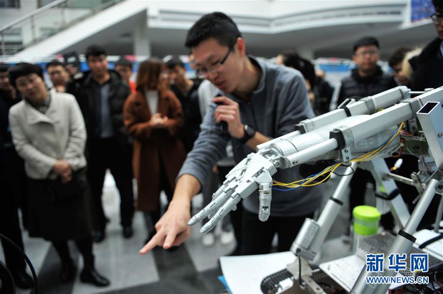 11月18日,在位于青岛西海岸新区的中国石油大学(华东),一名大学生向观众介绍科技创新作品“智能仿生手”。当日,中国石油大学(华东)大学生科技创新创业成果展在该校举行,展览汇集了130多项大学生科技创新创业项目。新华社发(俞方平 摄)